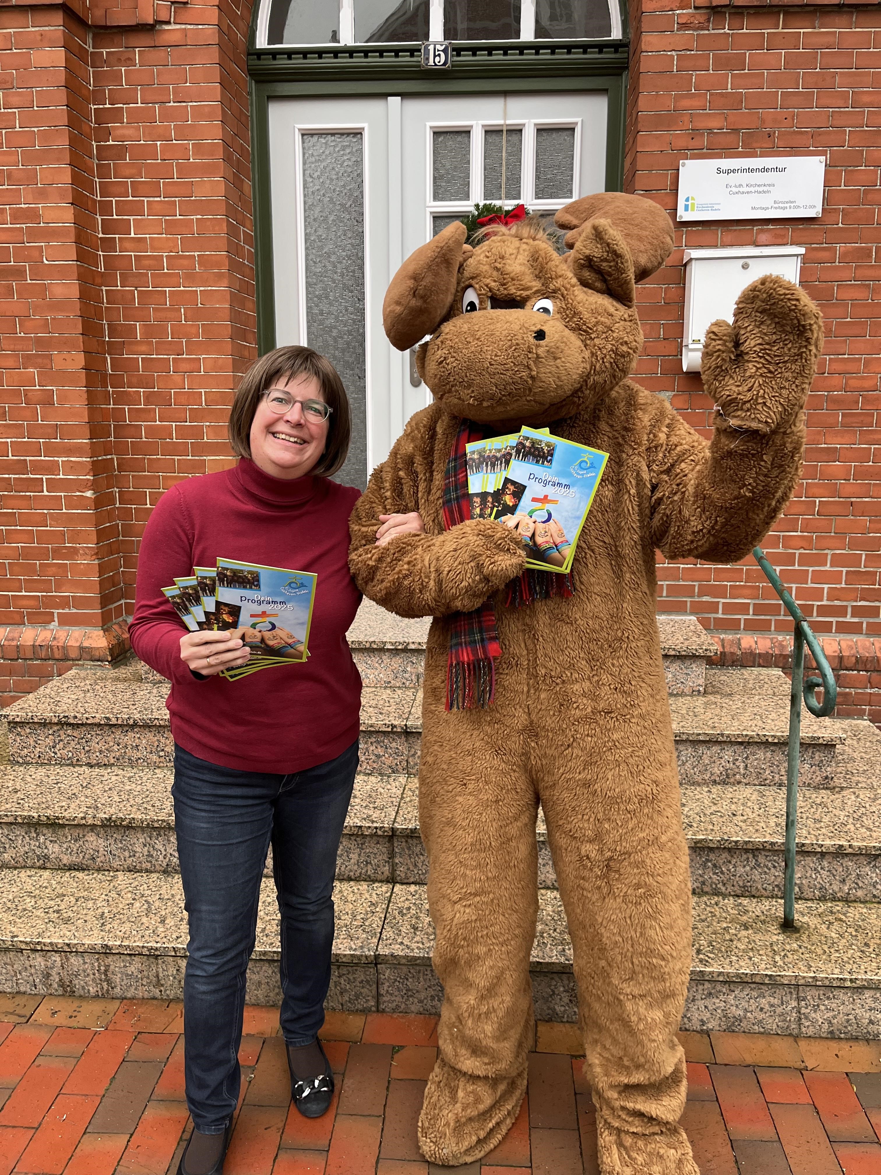 Meet & Greet mit Elch Gunnar: Superintendentin Kerstin Tiemann staunte nicht schlecht über den haarigen Gesellen, der da plötzlich vor ihrem Dienstsitz in Otterndorf auftauchte.