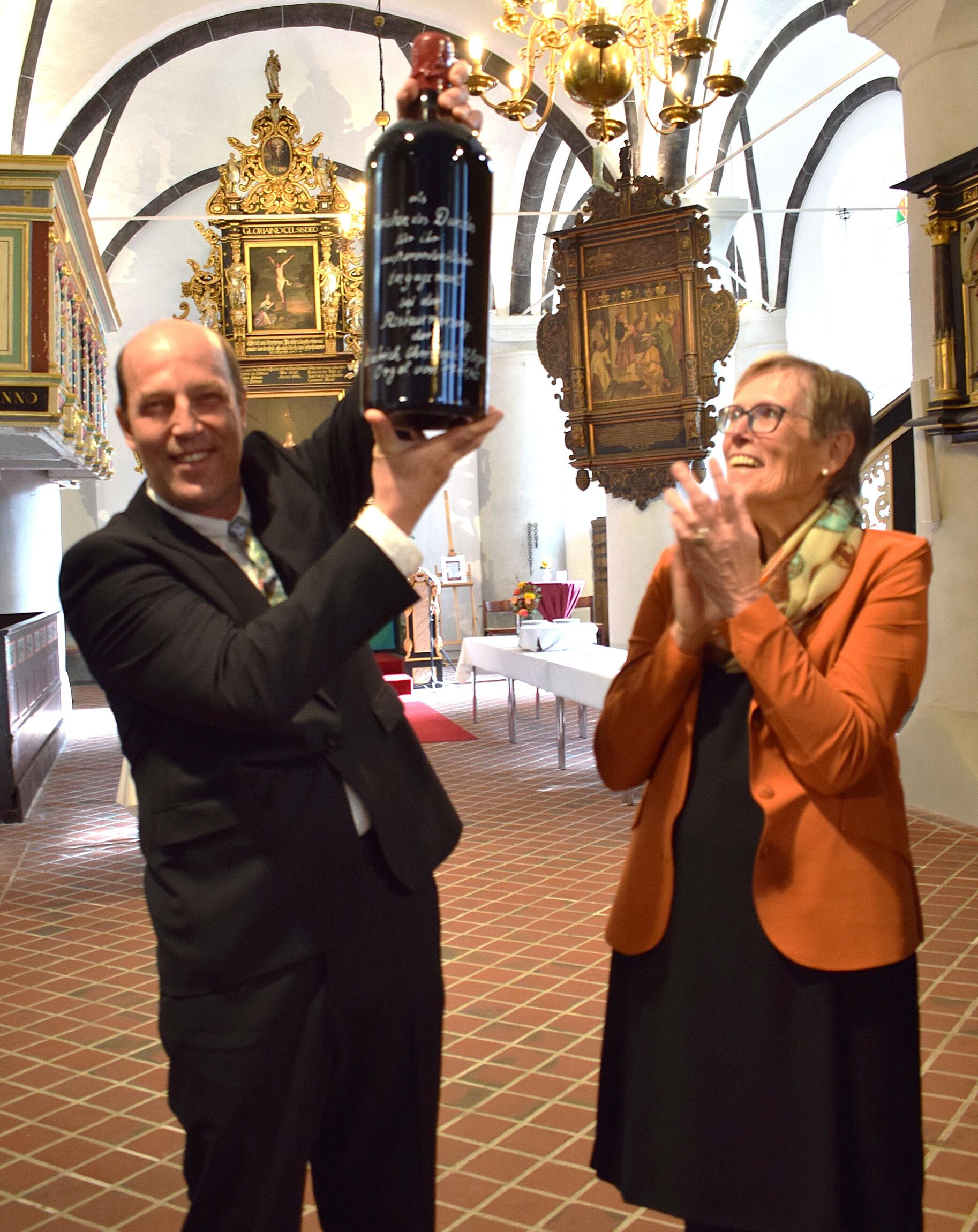 Und eine Überraschung gibt es für den Restaurator aus Leer zum Schluss des Gottesdienstes auch noch: Da er nach eigenen Angaben noch nie vom berühmten Orgelwein gekostet habe, überreichen ihm Kröncke und ihre Helfer drei riesige Flaschen Goliath. Pastor Niehus: "Der Orgelbauer, dem die Gemeinde besonders dankbar ist, hat in früheren Jahrhunderten nicht nur den vereinbarten Lohn erhalten, sondern auch Wein geschenkt bekommen." Und zwar so viel Wein, wie in die größte Pfeife passe. "Das schaffen wir in Otterndorf nicht, weil die Orgel so groß ist", sagt der Pastor, "es wären nämlich ungefähr 200 Liter Goliath gewesen." Niehus schmunzelt, als er sagt: "Wir haben ihn - praktisch für die Handhabung und symbolisch für den dreieinigen Gott - auf drei Flaschen á 6 Liter aufgeteilt."