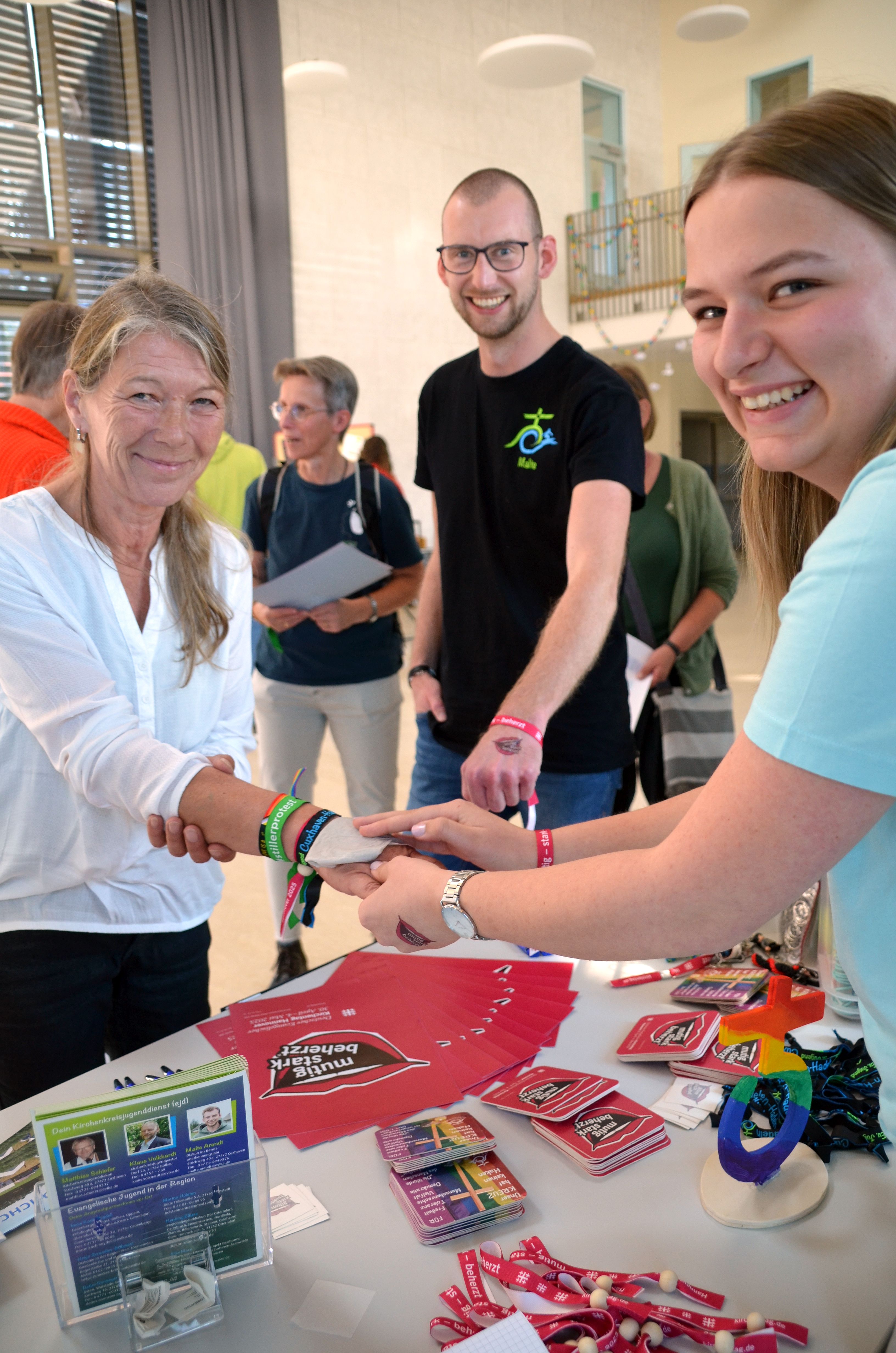 Nach heißer Suppe im Pavillon spazierten die Kirchenvorsteher zur Grundschule. Dort hatten fleißige Hände diverse Stände aufgebaut, an denen Vertreter von Organisationen und Einrichtungen im Kirchenkreis mit den Gästen ins Gespräch kommen sollten. Die Diakonie Cuxland war ebenso vertreten, wie der Friedhofsverband. Auch die Evangelische Jugend im Kirchenkreis war mit einem Stand vertreten, an dem es unter anderem selbstklebende Tattoos gab. Weitere Stände waren dem Klimaschutz und neuen Energien, alternativen Gottesdienstformaten und dem Projekt "EwigKite" gewidmet.