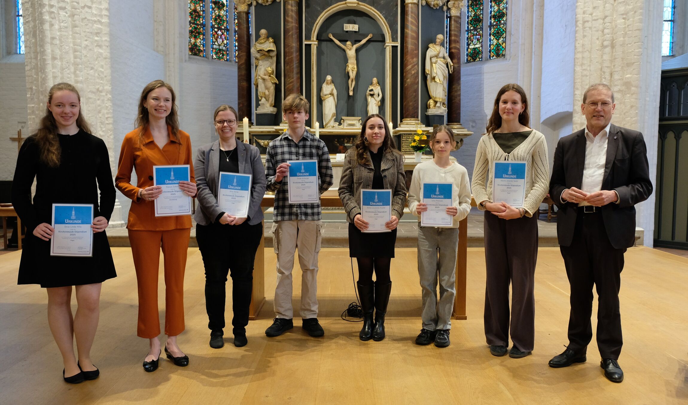 Der Sprengel Stade baut seine musikalische Nachwuchsförderung weiter aus und zeichnet acht Stipendiaten in einer musikalischen Feierstunde aus. Sechs Frauen und zwei Männer erhalten aus der Hand von Regionalbischof Hans Christian Brandy (Stade) ihre Stipendiums-Urkunden. Ganz besondere Freude bei Eeva-Linda Hilla: Die junge Dame aus Hechthausen ist diesmal die einzige Stipendiatin aus dem Kirchenkreis Cuxhaven-Hadeln.
