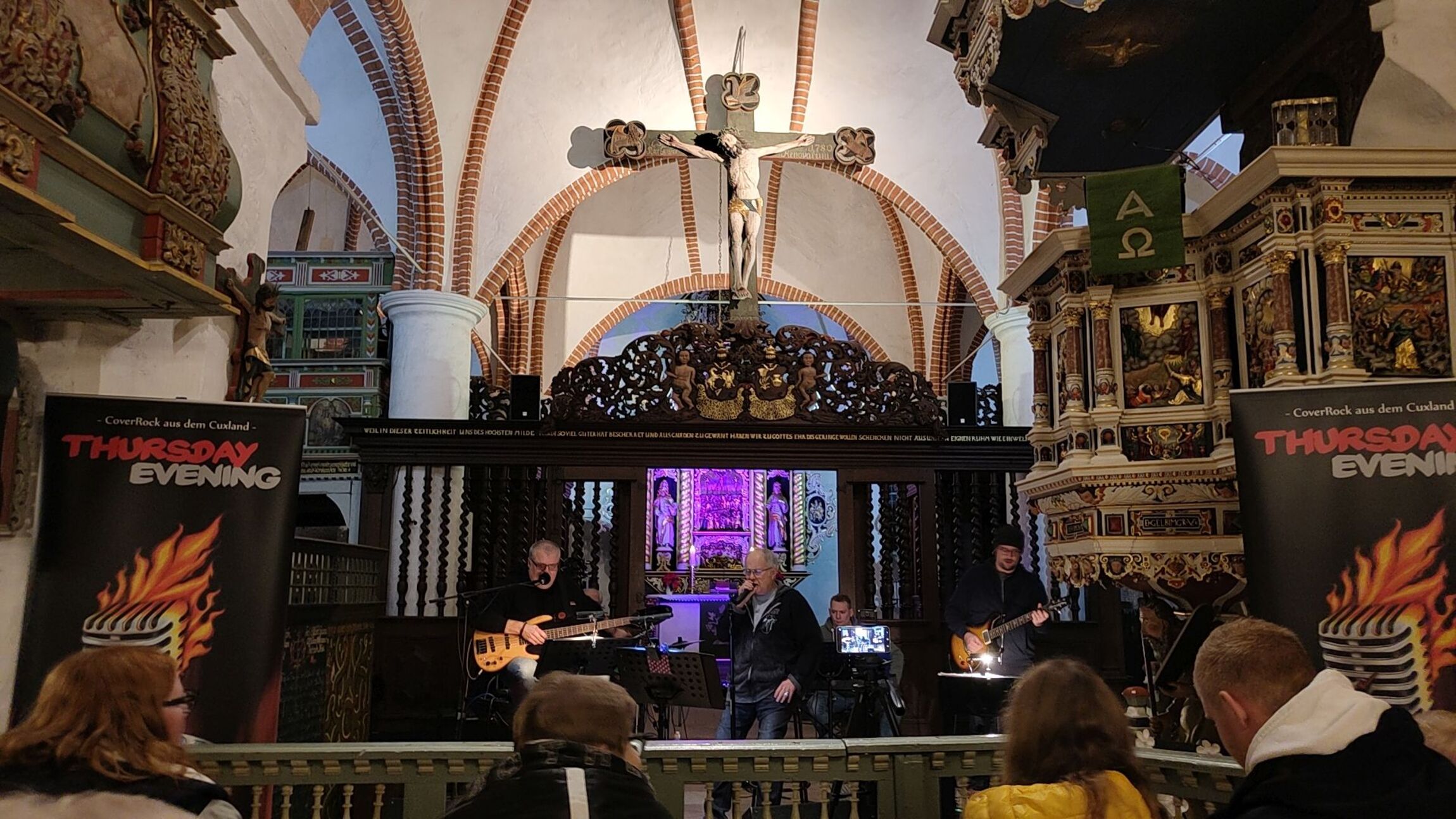 Wer hätte gedacht, dass sanfte Rockklänge die ehrwürdigen Mauern einer Kirche genauso zum Beben bringen könnten wie die Lautsprecher eines Rockclubs? Genau dieses Erlebnis bot die CoverRockband „Thursday Evening“ aus dem Cuxland, die kürzlich im Lüdingworther Bauerndom gastierte. Frontmann Reiner Fröhlich sowie Hans-Detlef Timm (Schlagzeug), Andreas Kaeding (Bass, Gitarre, Gesang), Malte Müller (Gitarre) und Florian Heller (Keyboard) nahmen das Publikum mit auf eine 90-minütige Reise durch die Welt des sanften Rock. Das Motto des Abends lautete: „Glaube, Liebe, Rock ’n’ Roll“.