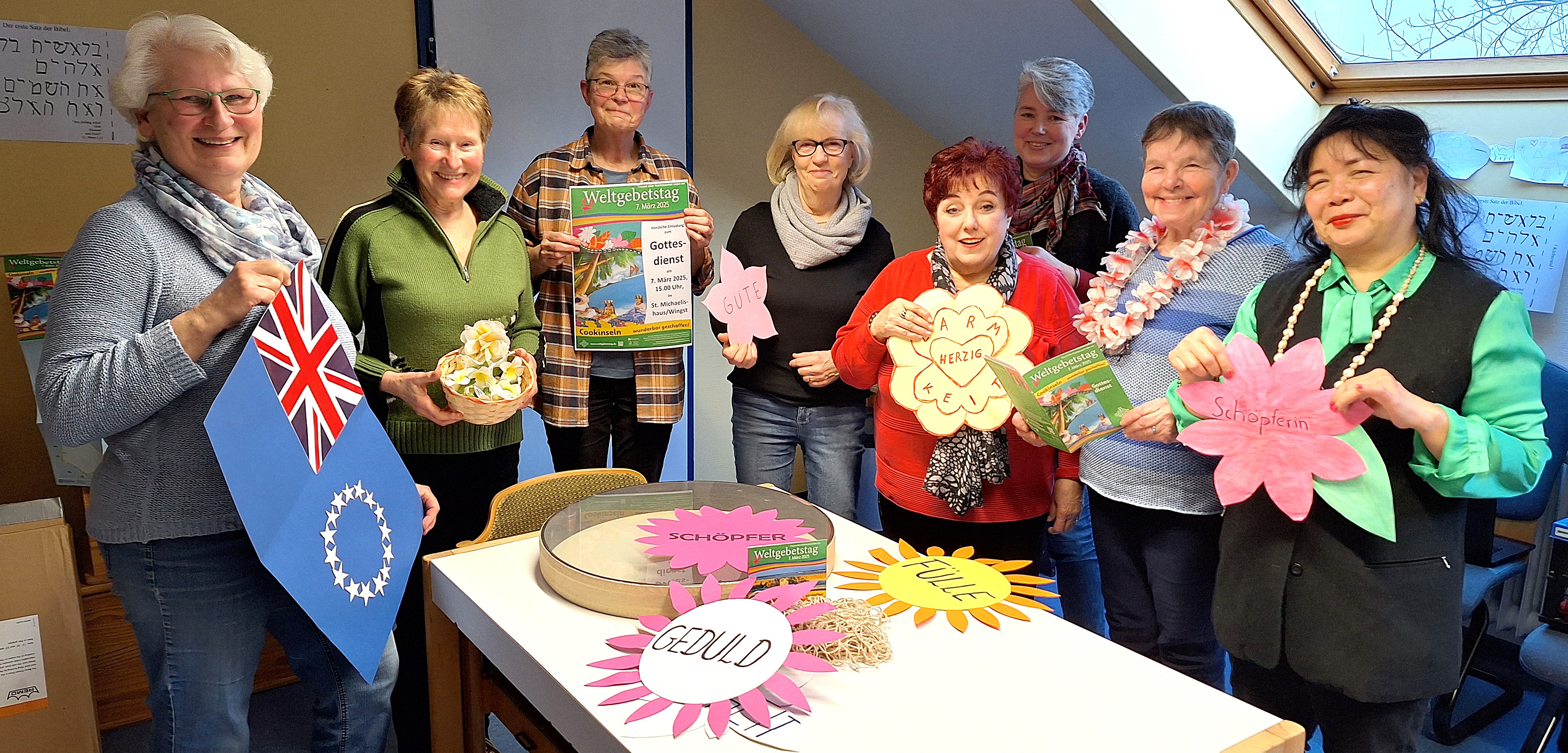 Petra Junge, Helga Kraushaar, Heidrun Scheelen-Schmidt, Marlies Rolapp, Karin Gabel, Meike Baack, Ulli Otto und Lany Kochius sind auf der Zielgeraden ihrer Vorbereitungen. Die kleine Gruppe aus den Kirchengemeinden Bülkau und Cadenberge/Wingst - erstmals in dieser Konstellation am Werk - hat im Gemeindehaus an der Claus-Meyn-Straße sämtliche Materialien ausgebreitet, mit denen sie "ihren" Gottesdienst am Weltgebetstag ausgestaltet wollen: Unter anderem haben sie in liebevoller Fleißarbeit zahlreiche Blüten aus buntem Papier gestaltet - beschriftet mit Begriffen, die im Mittelpunkt stehen sollen an diesem besonderen Tag. Von Güte, Geduld und Fülle ist da unter anderem zu lesen, von Barmherzigkeit, Gemeinschaft und Schöpfung. Ferner gehören landestypische Blumen zum Umhängen und Muschelketten zur Deko, wie sie auf den Cookinseln - rund 3500 Kilometer nordöstlich von Neuseeland im Südpazifik gelegen - gern getragen werden.