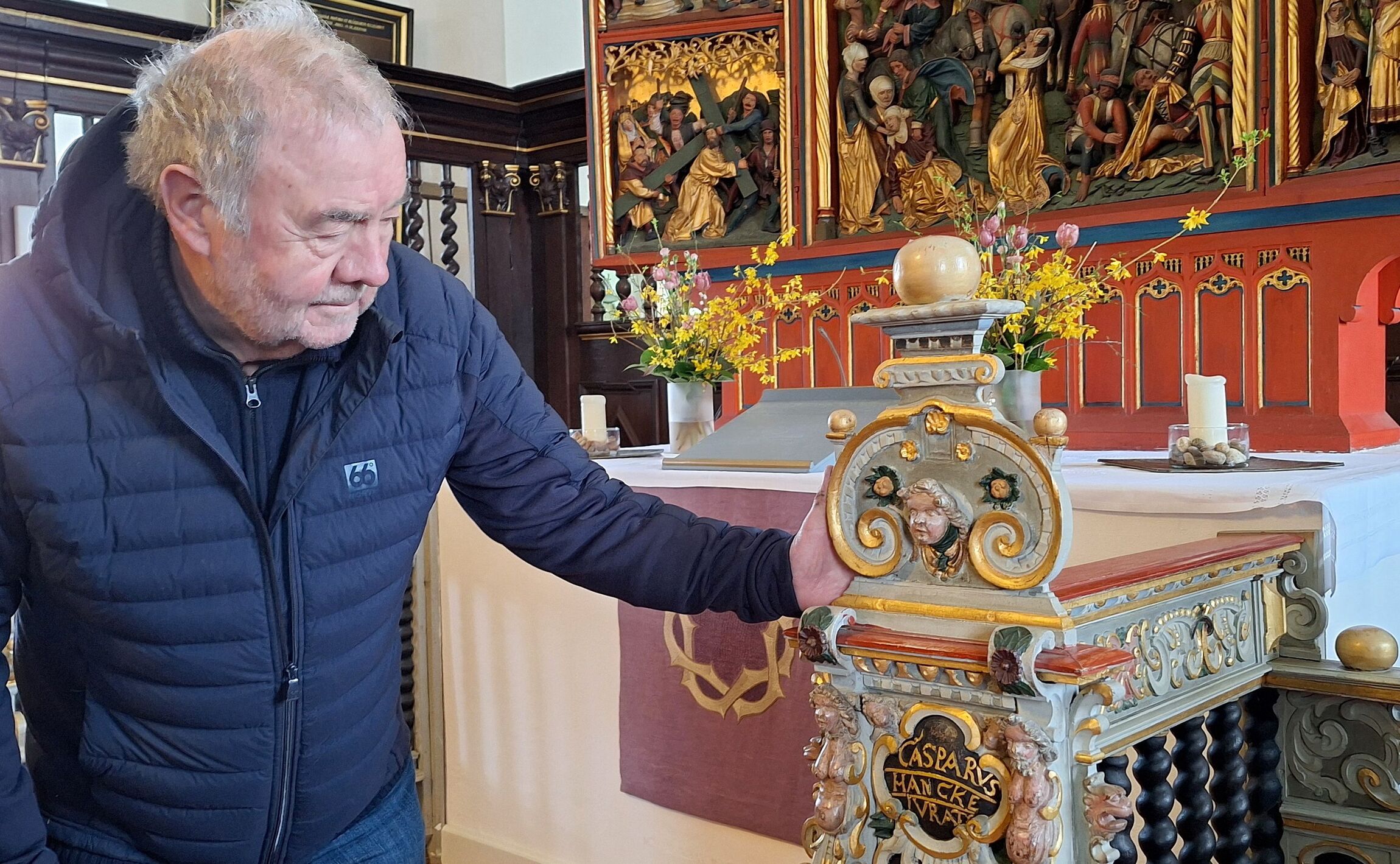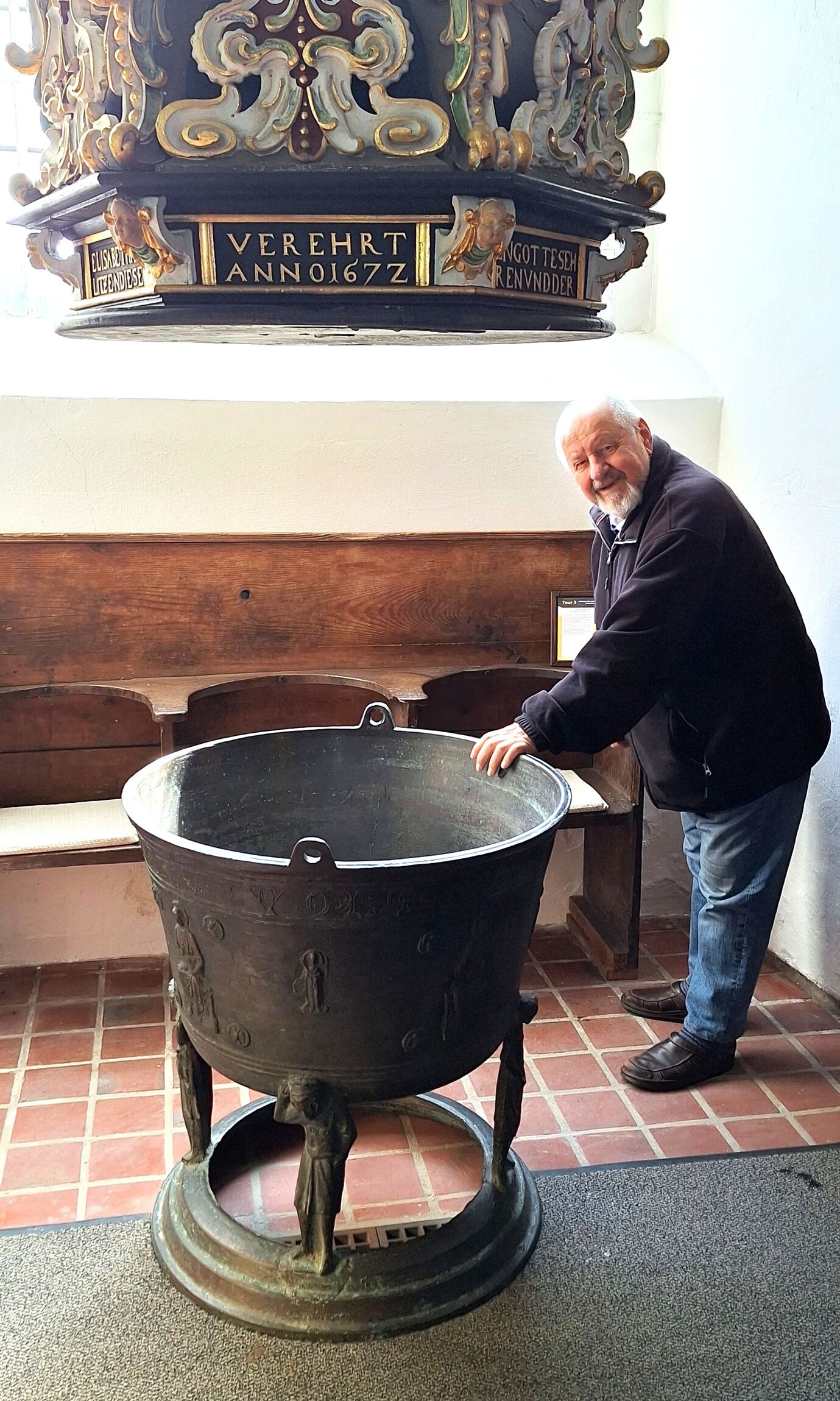 Schröter ist "Kirchenwächter" mit Leib und Seele, gehört auf diese Weise gern zur Gemeinschaft. Außerdem gibt er - mit einem Augenzwinkern - gerne zu, „dass ich als ehemaliger Pädagoge von der ,Lehrerkrankheit‘ befallen bin und den Leuten alles erklären möchte, was ich über die Kirche weiß“. Spricht’s, schmunzelt und macht sich auf zum bronzenen Taufkessel aus dem frühen 14. Jahrhundert – dem ältesten Ausstellungsstück. „Früher wurde das Wasser hier mit Feuerholz erwärmt, damit die Täuflinge nicht erschraken“, sagt Schröter.