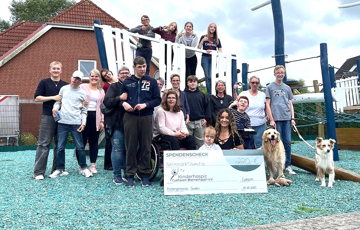 Anlässlich der Konfirmation von Fiona, die selbst vom Kinderhospiz Cuxhaven-Bremerhaven begleitet wird, sammelte die Kirchengemeinde Groden gemeinsam mit ihren Mitkonfirmanden und Mitkonfirmandinnen im Konfirmationsgottesdienst eine Kollekte. Die Hälfte des Betrages – 220 Euro – kam dem Kinderhospiz zugute.