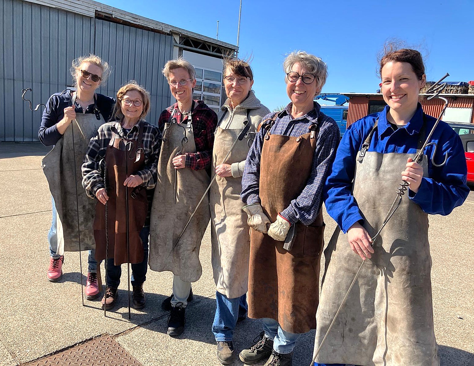 Zur Leitung und Moderation des ungewöhnlichen Workshops war Hilke Leu aus Bremerhaven angereist. An ihrer mobilen Schmiede zeigte die Künstlerin den erwartungsfrohen Damen, wie man denn das Feuer auf die richtige Temperatur bringt und wie man am besten den Hammer schwingt, um unter wohlgesetzten Schlägen dem Eisen Form zu verleihen.