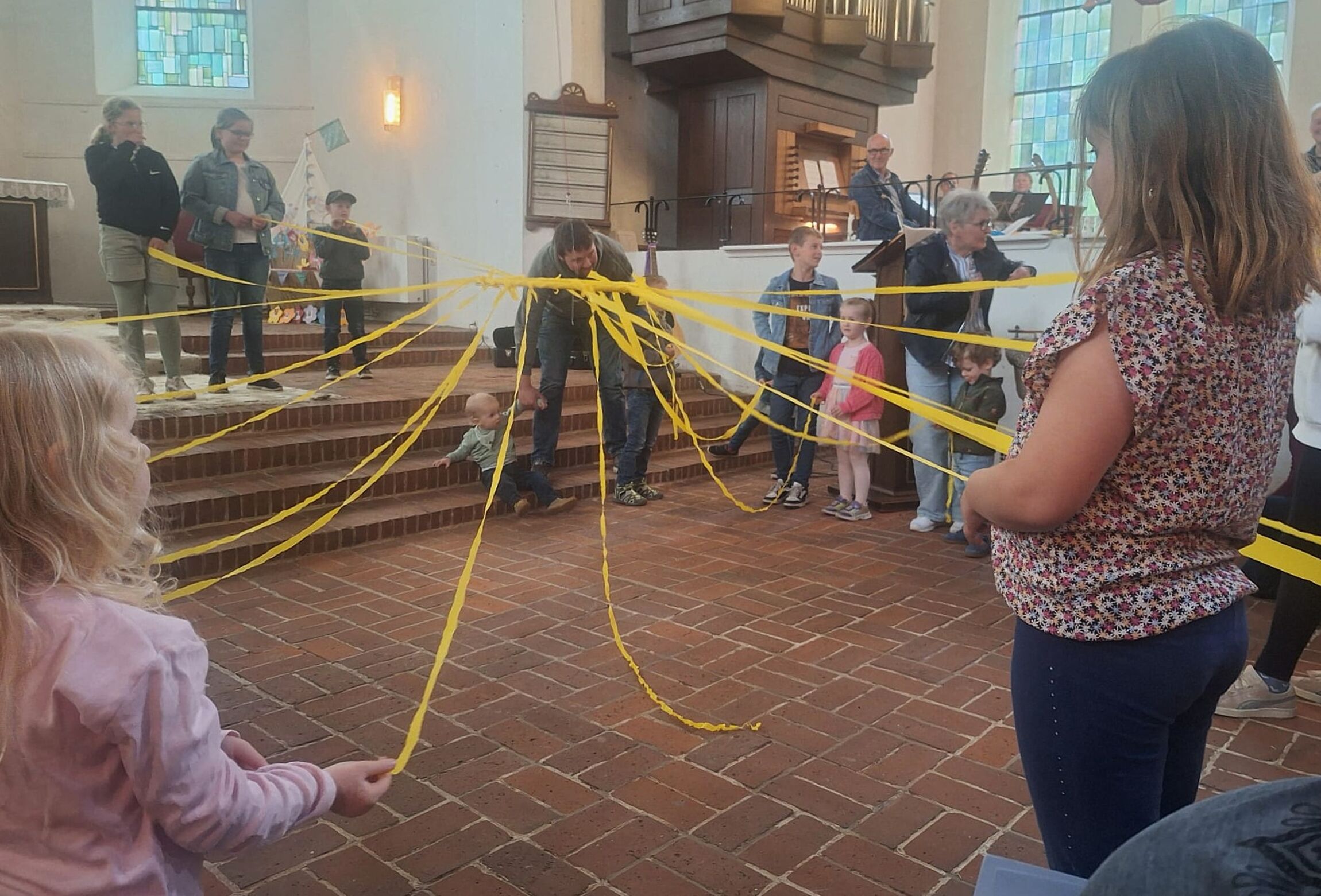 Erstaunt stehen die Kinder im Altarraum der St. Georg-Kirche in Wanna und halten ihre gelben Bänder fest, die sie an einem Ring befestigt haben. Plötzlich erhebt sich der gelbe Mittelpunkt und die Tauferinnerungs-Kinder können mit ihren Bändern darunter tanzen. So wird ihnen veranschaulicht, dass sie alle im Licht Gottes stehen und mit ihm verbunden sind. Zuvor haben die Jungen und Mädchen ihre Taufkerzen an der großen Osterkerze zum Leuchten gebracht und den Taufsegen erneuern lassen. Der Einladung zum Tauferinnerungsgottesdienst am Sonntag in St. Georg sind 15 Kinder mit ihren Familien und viele interessierte Gemeindeglieder gefolgt, von denen sich auch einige mit dem Wasserkreuz auf der Stirn am Taufbecken haben segnen lassen. Der Gitarren-Sing-Kreis und Britta Schumacher - diesmal auf ihrer Trompete – haben diesen besonderen Gottesdienst musikalisch gestaltet.