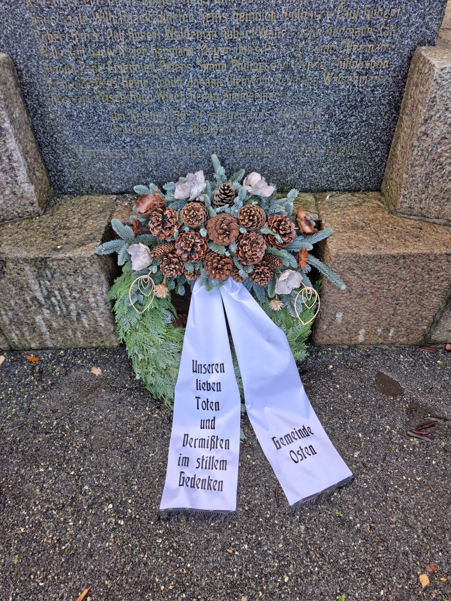 Im Anschluss an den Gottesdienst begab sich die Gemeinde zum Ehrenmal, um am Volkstrauertag der Opfer von Krieg, Terror und Gewalt zu gedenken. Begleitet von Orgelklängen und dem Lied „Ich hatt’ einen Kameraden“ wurde ein Kranz niedergelegt – ein stilles Zeichen der Verbundenheit mit den Toten und den Leidtragenden vergangener und gegenwärtiger Konflikte.