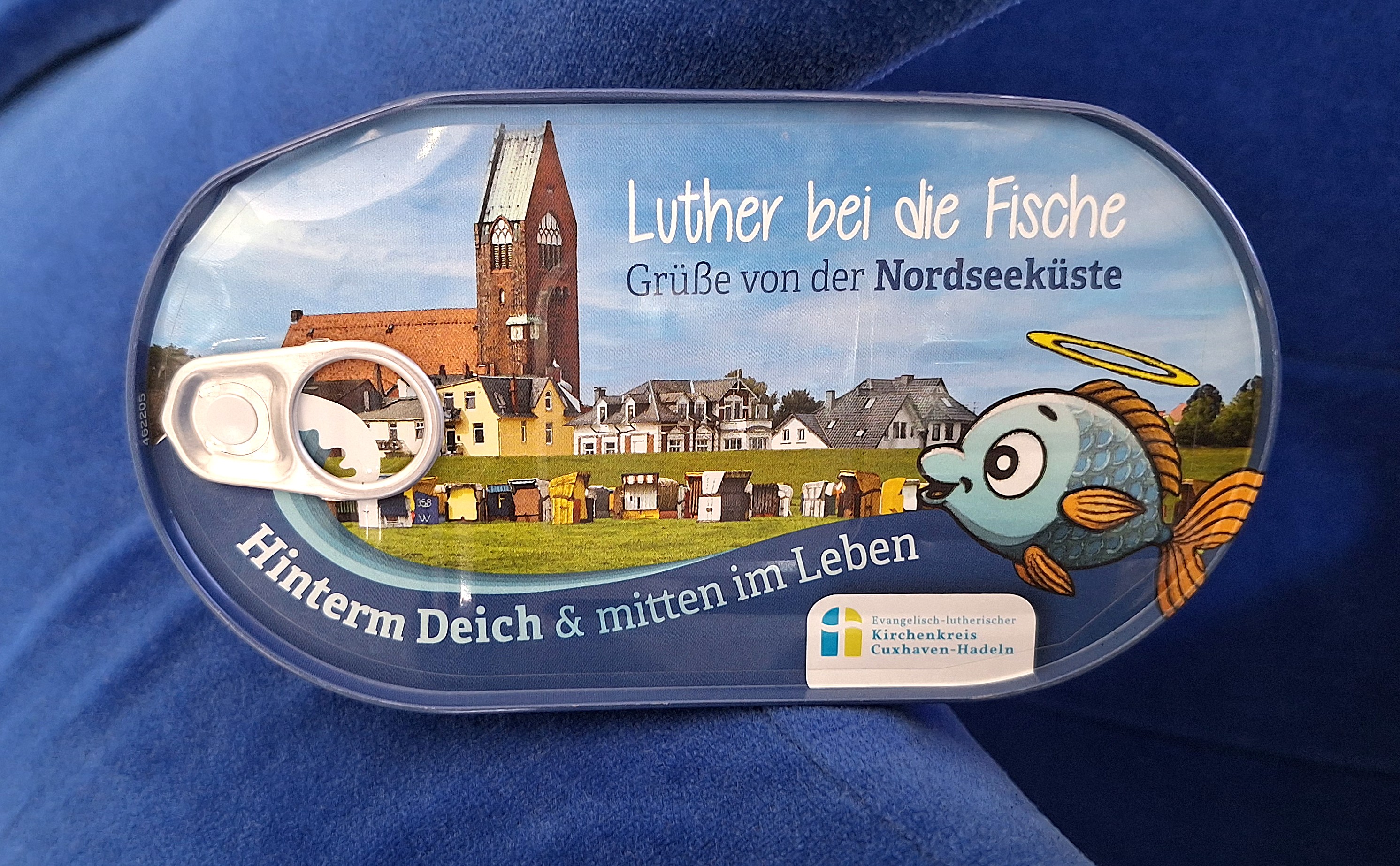 Mit am Fischstand steht auch Pastor Detlef Kipf. Der kreative Gottesmann aus der Cuxhavener Innenstadtgemeinde St. Gertrud hatte die Idee für den originellen Slogan "Luther bei die Fische", der dank kostenloser Unterstützung der Firma Appel Feinkost aus Cuxhaven insgesamt rund 1600 Fischdosen ziert. Am Stand des Kirchenkreises werden diese Dosen ein echter Hingucker sein - und ein "Türöffner" für so manches Gespräch.