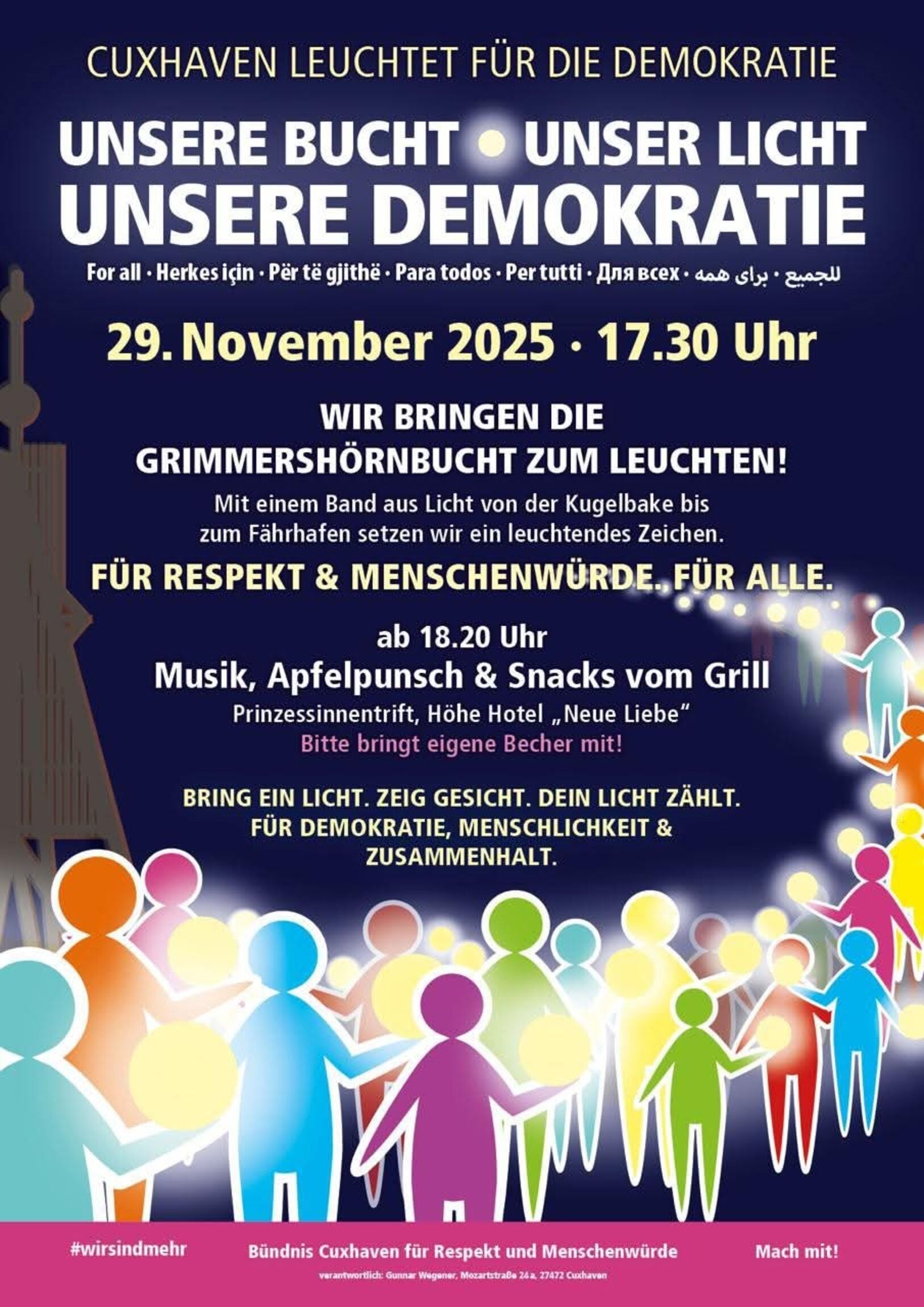 Cuxhaven setzt am Freitag, 29. November 2025, ein sichtbares Zeichen für Demokratie, Respekt und Menschenwürde: Unter dem Motto „Unsere Bucht – Unser Licht – Unsere Demokratie“ wird die Grimmershörnbucht mit einem durchgehenden Band aus Lichtern von der Kugelbake bis zum Fährhafen zum Strahlen gebracht.