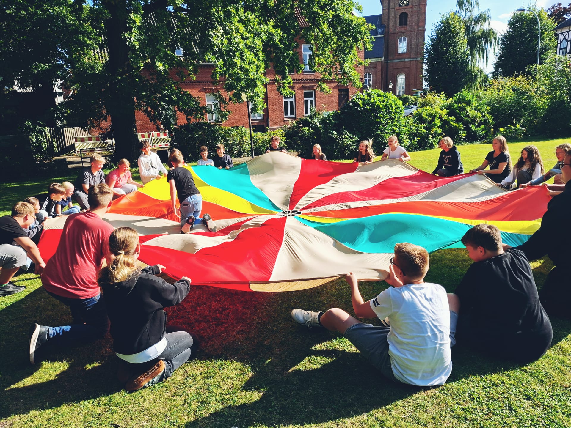 Der Auftakt ist bewusst locker gehalten: Musik, Snacks und eine offene Atmosphäre erleichtern das Ankommen. Danach geht es gleich ins Miteinander – vom Namensball bis zu Fallschirmspielen. Es wird gelacht, gerannt, ausprobiert. Was nach Spaß aussieht, hat ein klares Ziel: Hemmungen abbauen, Namen lernen und erste Gemeinschaft erfahren.