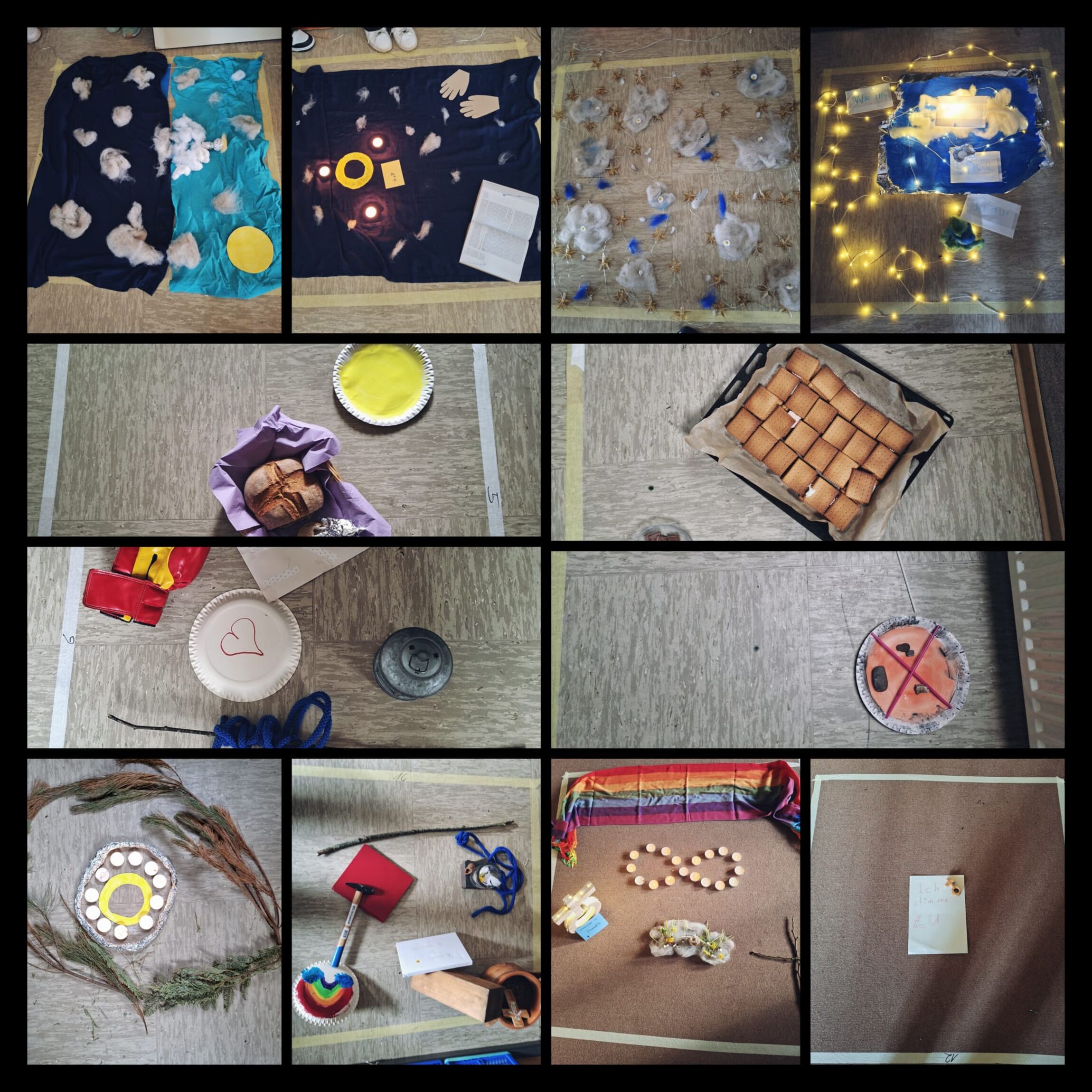 Bereits um 15 Uhr waren die Hauptamtlichen vor Ort. Mit ruhigen Handgriffen bereiteten sie alles vor, als würden sie einen Boden bereiten, auf dem später Gedanken wachsen konnten. Stühle wurden gerückt, Bildkarten ausgelegt, und mit Kreppband entstanden kleine Flächen – unscheinbare Quadrate, die bald Bedeutung tragen sollten. Kurz darauf trafen die ersten Konfirmandinnen und Konfirmanden ein.