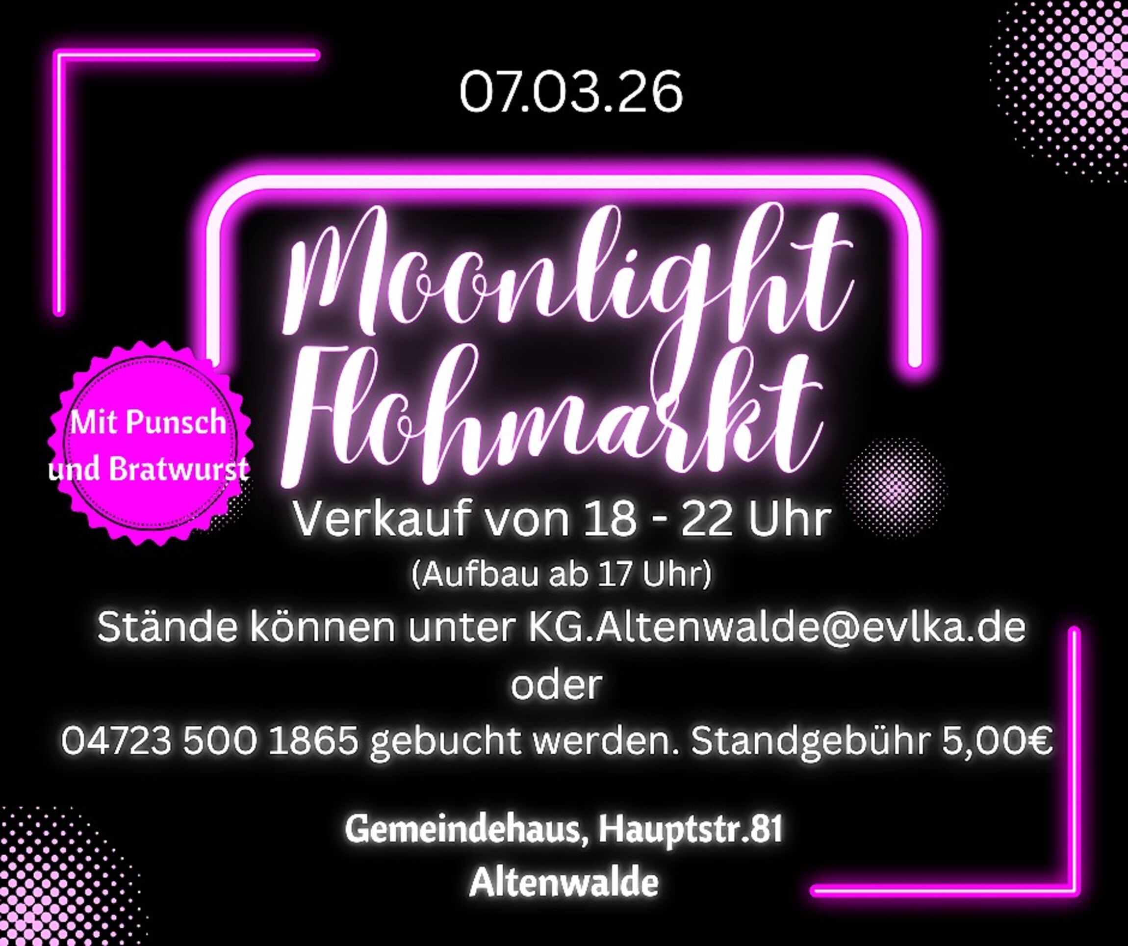 Es wird lebendig, gemütlich und ein bisschen magisch: Die ev.-luth. Kirchengemeinde Altenwalde und das Gemeinwesen-Projekt „Gute Nachbarschaft“ laden herzlich zum Moonlight-Flohmarkt ein. Stattfinden wird er am Samstag, 7. März 2026, ab 18 Uhr. Wer Lust auf Stöbern, Klönen und kleine Schätze hat, sollte sich diesen Abend unbedingt vormerken. Anmeldungen bis zum 28. Februar.