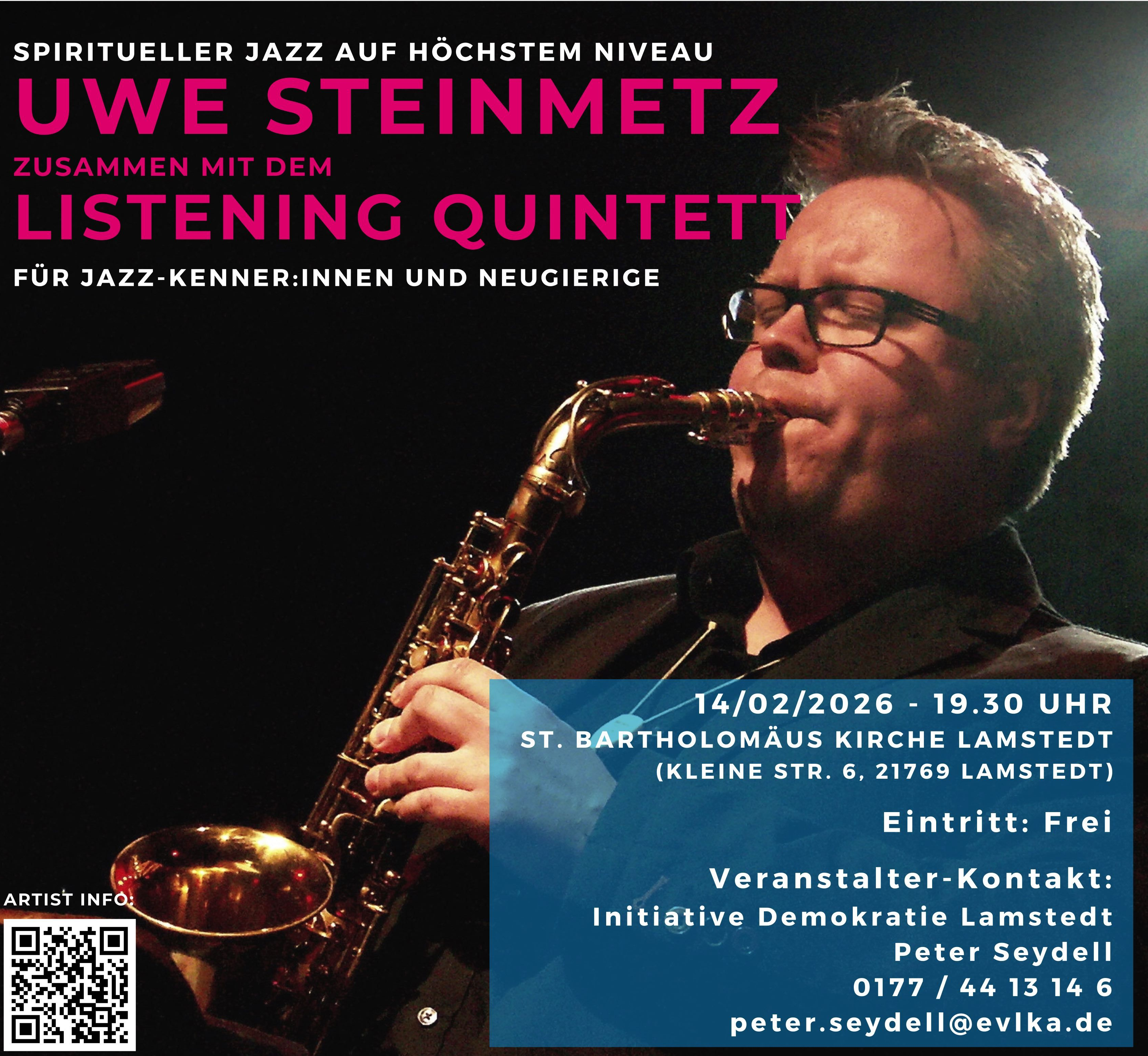 Uwe Steinmetz, geboren 1975 in Bremervörde, bringt mit seinem Listening Quintett aktuelle Kirchenmusik und Jazz aus allen sieben Kontinenten nach Lamstedt. Neben der Musik teilen die fünf Musikerinnen und Musiker kurze persönliche Erlebnisse, die zeigen, wie das bewusste Hören ihren Alltag prägt – und ihr Bild von einem friedlichen, gerechten Zusammenleben formt.